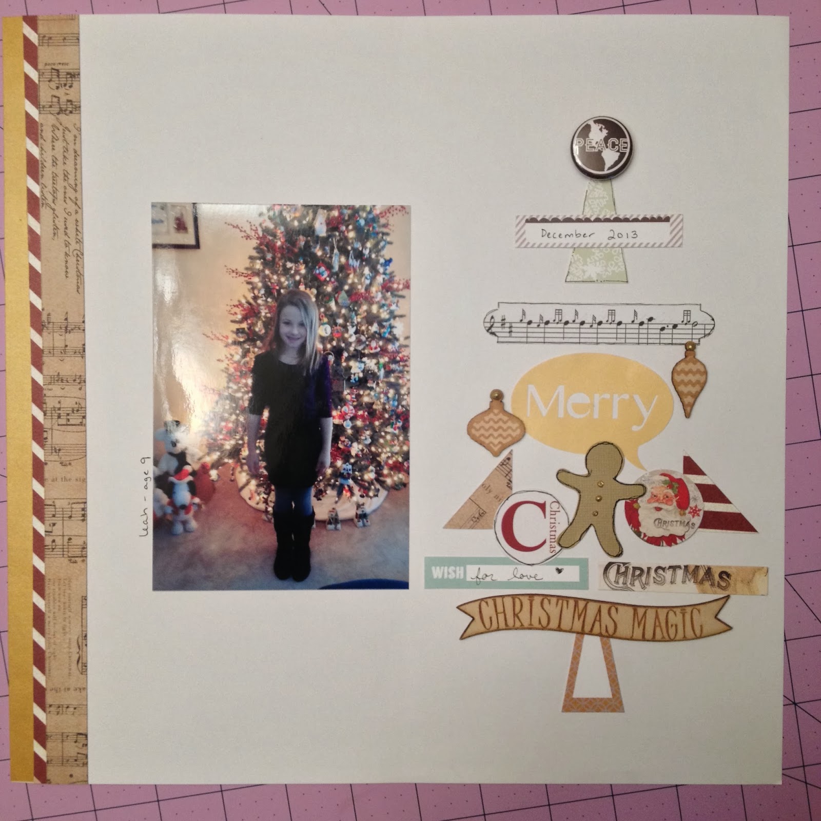 I lifted this layout from a member of the Scraptastic Club design team. I absolutely loved it. I had quite a few tags left that I didn't know what to do with and this layout was perfect. And Leah was thrilled that I used the gold vellum Merry for her layout :)
